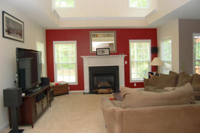 I particularly like my accent wall having a fireplace on it, the white of the fireplace contrasts nicely with the red of the wall.